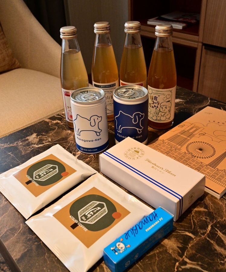 9027号室は横浜港がある神奈川県がテーマ。鎌倉彫の置物や箱根寄木細工のリモコンラックのほか、地酒の一合缶「Kanagawa-Ken」などを用意しています。