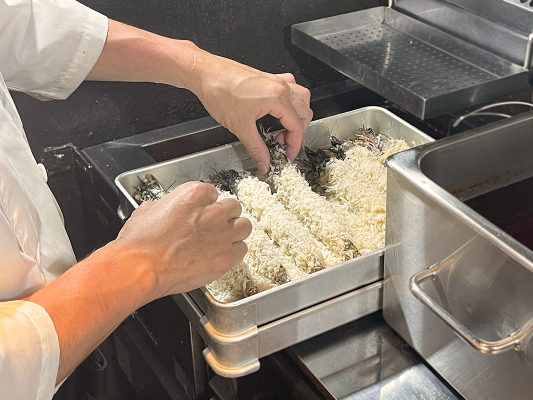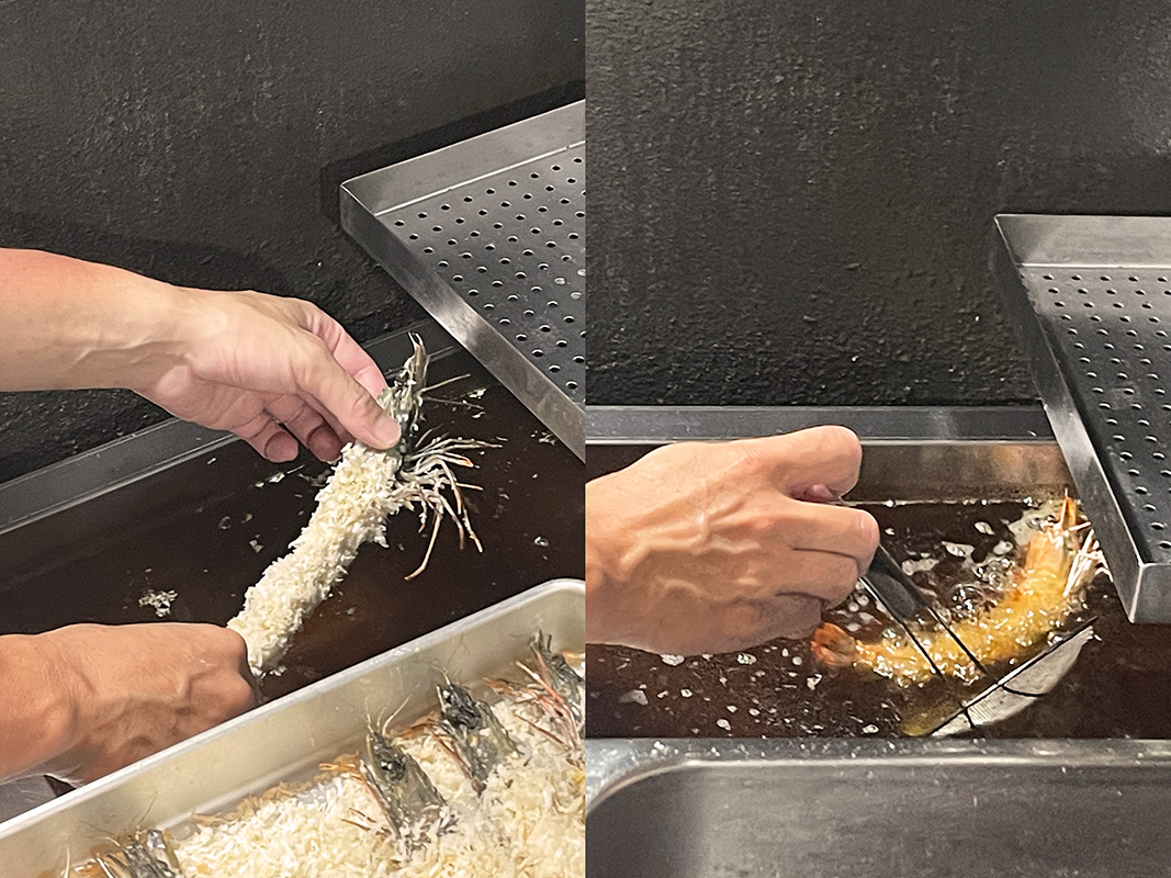 高温で10秒を目安に揚げる、外はサクサク中はレア状態の生エビフライ。