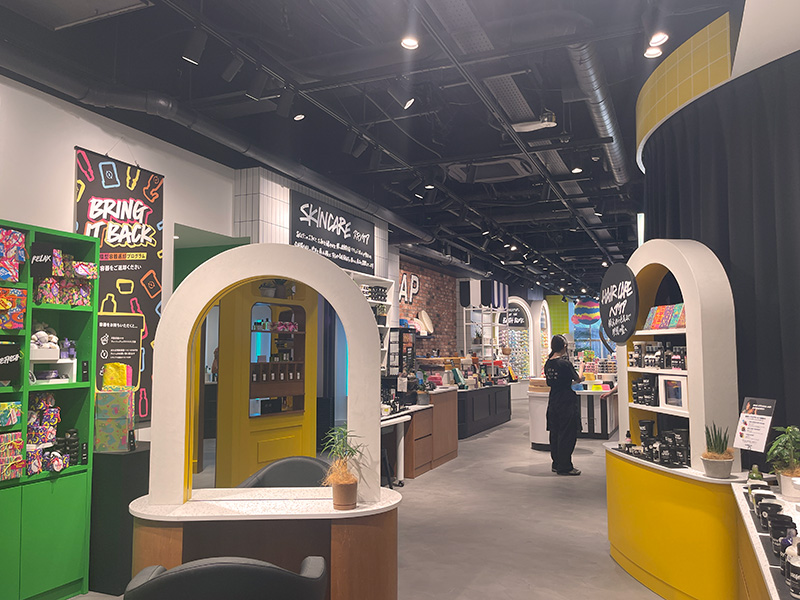 空間は広々としていて開放感があり、「LUSH」のイメージカラーであるグリーンやイエローをメインに色とりどりでカラフルな色を取り入れています。全体的にポップな印象に仕上がっているので、その場にいるだけで楽しい。