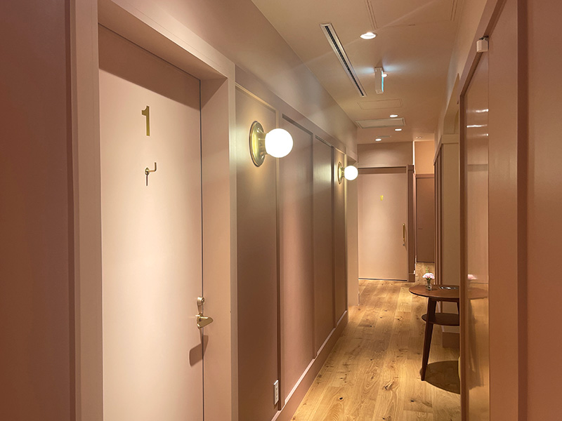 スパフロアは、ダストピンクを基調としたキュートな空間。落ち着いたトーンの色味や木製のインテリア、温かみのある照明で心穏やかに過ごせるような場所に仕上がっています。