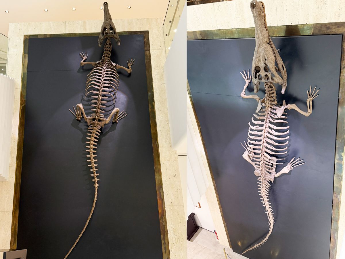 壁に飾られた「マチカネワニ」の化石のレプリカは、なんと大きさ約8メートル! オリジナルの標本は大阪大学総合学術博物館に収蔵されていて、国登録記念物にもなっています。1階から見上げた印象と、2階から見下ろす印象が異なるので、ぜひ見比べてみてください。