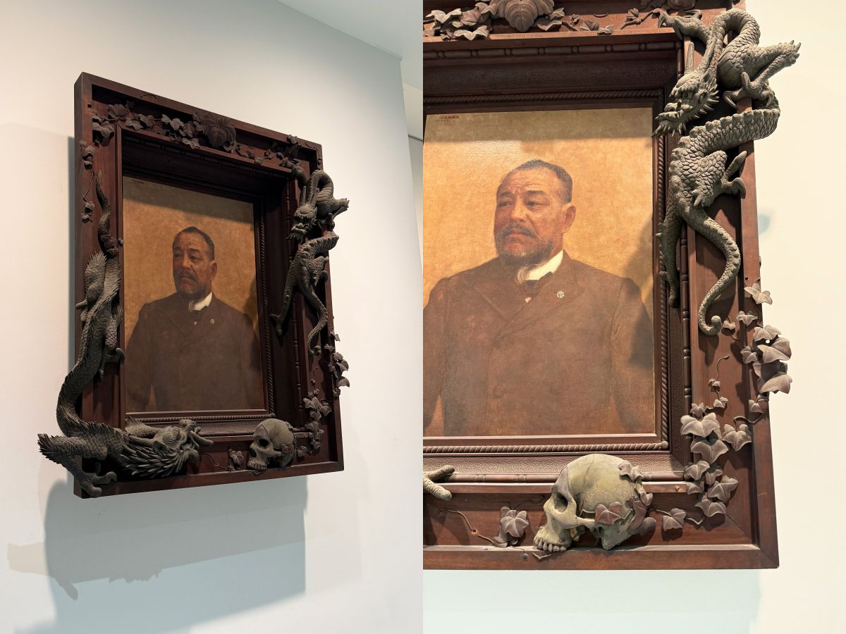 壁に飾られているこちらの肖像画は、東京大学内にある最古の肖像画で、医学部解剖学教室の初代教授・田口和美が描かれています。描いたのは画家・高橋勝蔵で、自身の趣味である明治工芸を生かした額縁にも注目! 解剖学の教授らしい頭蓋骨のモチーフや、立体的な龍は圧巻です。