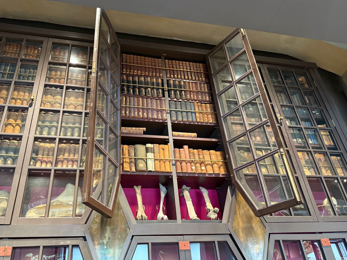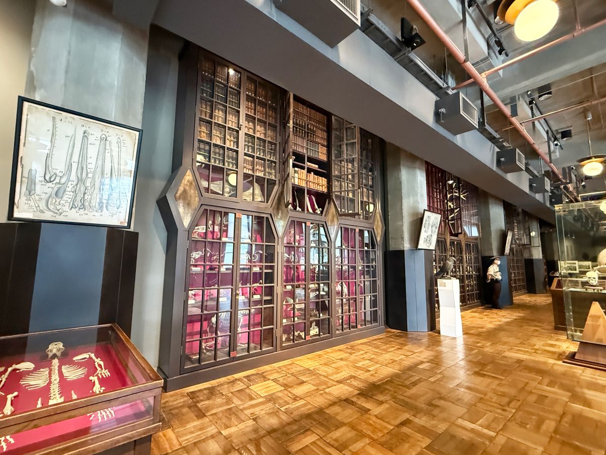 展示物を保管している棚は、昭和初期に作られたもので2010年代まで東京大学で実際に使われていたガラスのキャビネット。2つの本棚を連結していて、上半分は逆さまに配置していて、見た目にもインパクトがあります。