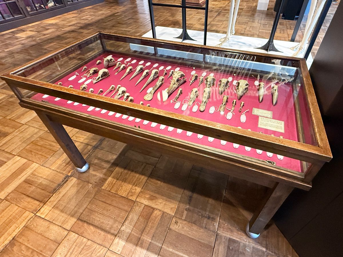 展示方法のこだわりにも注目。写真の鳥類頭蓋骨コレクションの展示ケースと床の間に、丸い金属製の底上げを入れています。これは少し浮遊した感覚で展示を見ることで、古いものに現代性を与えるためのデザイン配慮がされています。
