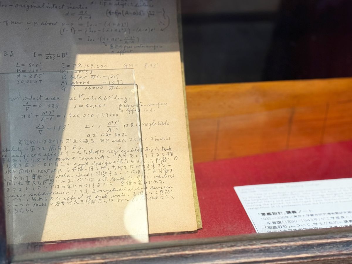 船の模型や、建築に関する資料が展示スペースを発見。なかでも特に気になったのは、大学の軍艦設計の講義内容をまとめた「『軍艦設計』の講義ノート」。大日本帝国海軍で多数の軍艦を設計した平賀譲の講義を学生がノートにまとめたもので、先輩から後輩へ代々受け継がれてきた資料なのだとか。