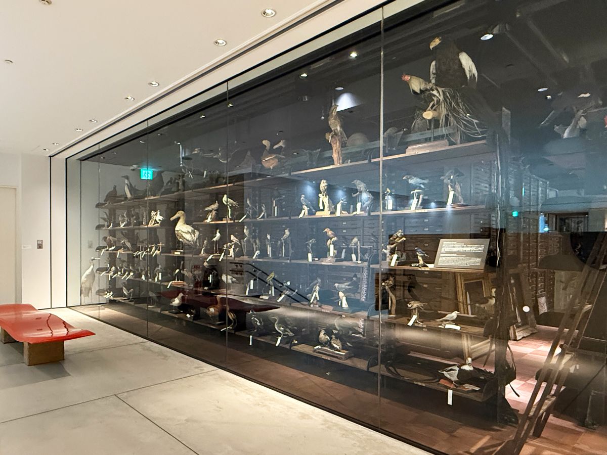 ガラス壁にずらりと並ぶのは、山階鳥研究所からの寄託標本。なんと総数357点! 収蔵展示室内には老田野鳥館から寄贈されたものや、東京大学所蔵の鳥類剥製もあります。
