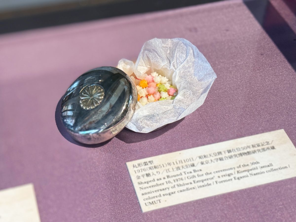 皇室でのさまざまな儀式で招待客に渡した引き出物「宮中下賜品紋入ボンボニエール」。銀製の入れ物にこんぺいとうが入っています。展示品7点それぞれに、何の式典でもらっているか書かれているので、じっくり内容を見てみるのもおもしろいです。