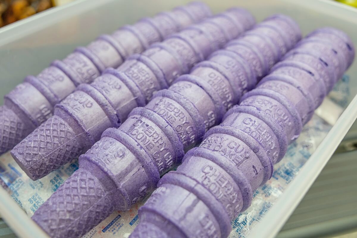 米粉と紅芋パウダーを使用したコーンはグルテンフリーで、しかもアレルギー28品目不使用。小麦粉で作るコーンと比べてサクサクッとした食感が強いのが特徴です。米粉は水気を吸収しやすいため、湿気の多い夏場は提供する前に水分を飛ばしているとのこと。 場所柄訪れるのは9割が観光客ですが、地元の常連客の姿も。