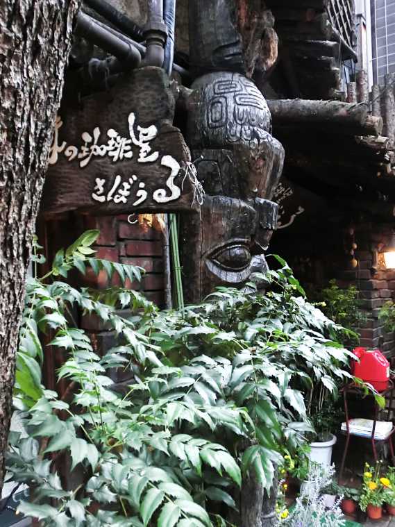 「さぼうる」の場所は神保町駅7番出口からすぐ。入口では赤い公衆電話とトーテムポールが出迎えてくれます。喫茶のイメージが強いのですが、23時までバーの営業もしているそうですよ。