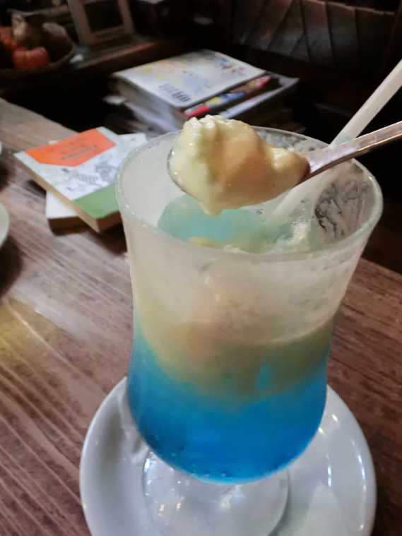 ソーダとバニラアイスを堪能。次第に溶け合いまろやかな味わいに