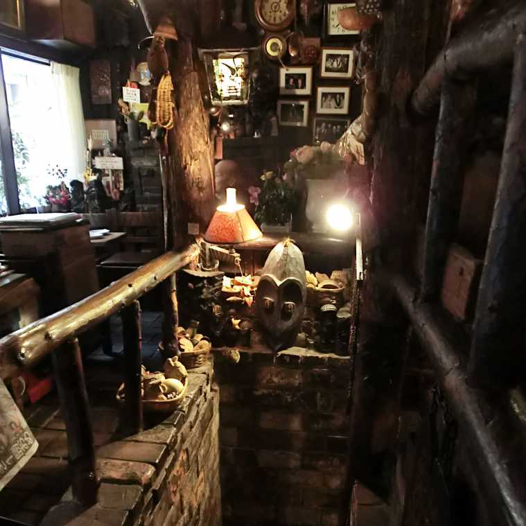 身も心も満たされ、ふぅーっとひと息。あらためて店内をよく眺めてみると、丸太やレンガで作られた空間は山小屋のよう。古い民芸品も所狭しと飾られていて個性的です。そんな空間にいると、なんだか昭和にタイムスリップしたような気分。
