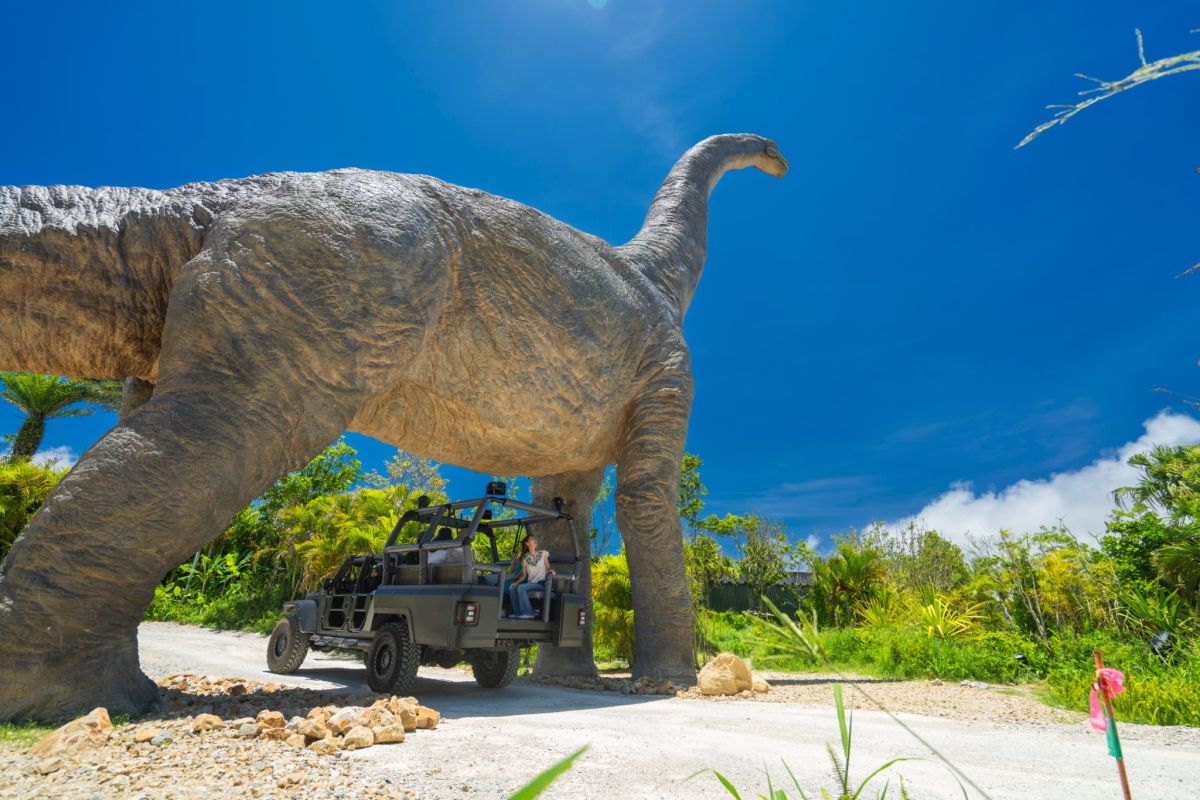 「ダイナソー サファリ」は、10人が乗れる装甲車でうっそうとしたジャングルへ出発。デコボコの悪路にガタガタと揺れる車体にしがみついて進むと、絶滅したはずの草食恐竜たちが現れます。パークの外からも頭部が見える、巨大なブラキオサウルスもお出迎え。足の下を装甲車で駆け抜けます。
