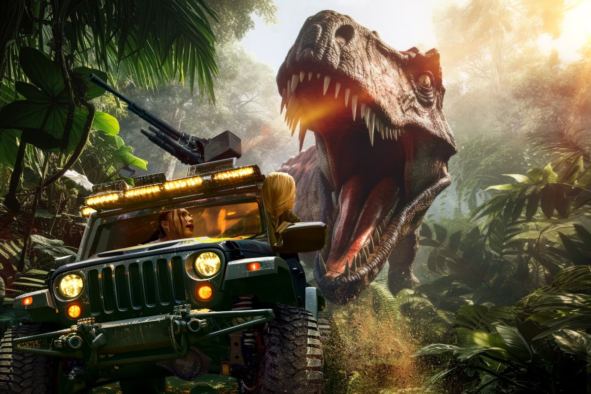 装甲車でT-REXから逃げきれ! 大興奮のジャングル探検「ダイナソー サファリ」