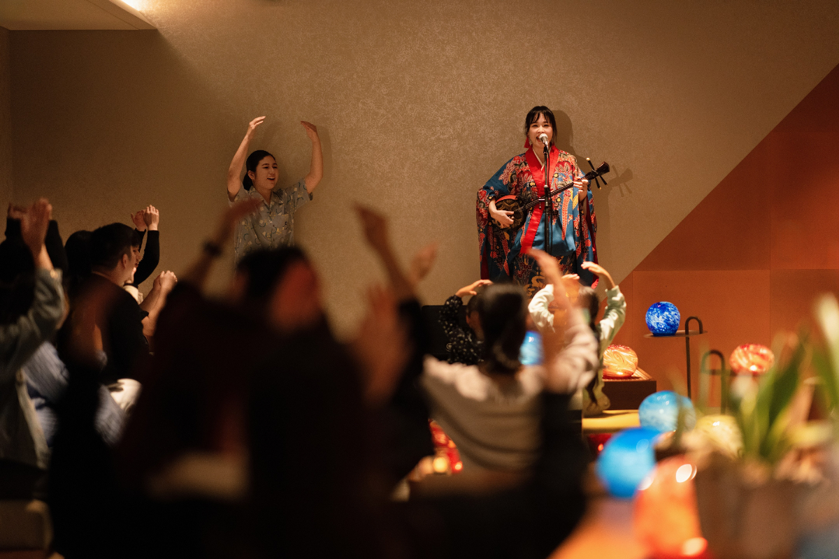 さらに、琉球ガラスを灯す幻想的な空間が拡大し、ライブの会場も鮮やかに進化! OMOのスタッフ、その日集まった宿泊者全員で、歌って踊ってちむどんどん(胸がどきどきワクワク)する時間を過ごせます。