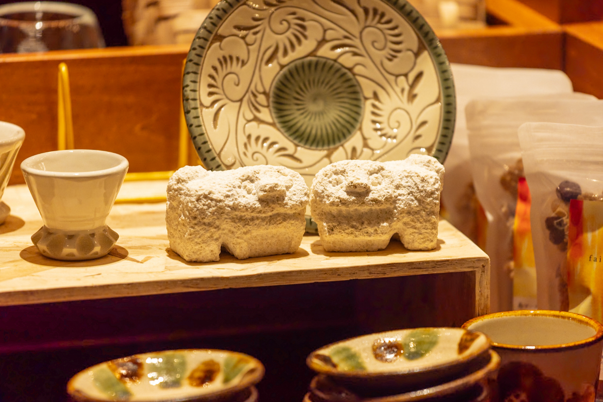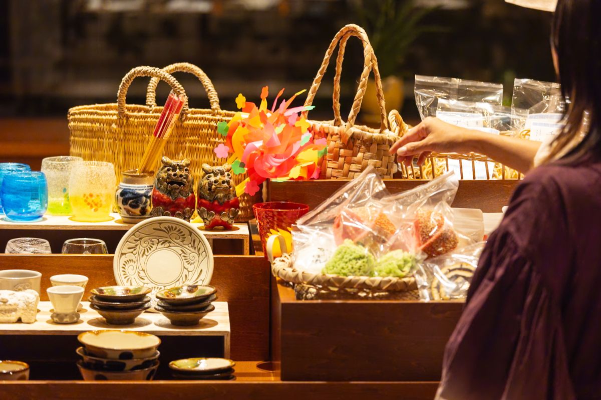 沖縄の焼物・やちむんや、琉球ガラス、シーサー、沖縄の染物・紅型(びんがた)のほか、沖縄のローカル菓子や行事に使われる玩具・カジマヤー(風車)など、街をこよなく愛するOMOスタッフが、本気でおすすめする隠れた名店の品々を集めた「夜市」がフロント前にオープン。街ナカにあるお店が閉店した後も、館内で時間を気にせずゆっくりとおみやげ選びができます。