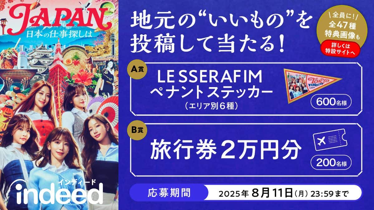 5人組ガールグループ・LE SSERAFIM(ル セラフィム)のCMでおなじみ、日本各地の仕事を探せる求人サイトIndeedが、全国の“いいもの”を募集する「#Indeedと全国いいもの探しキャンペーン」を実施中! 「地元ネタならどんとこい!」と、おでかけ情報サイト&旅行ガイドブックに携わるスタッフも、このキャンペーンに参加して、出身地のお気に入りグルメを猛プッシュ。あなたもぜひ、地元の“いいもの”をXで投稿してみて。LE SSERAFIMのグッズや旅行券が抽選で当たるだけでなく、もれなくもらえるプレゼントもありますよ♪