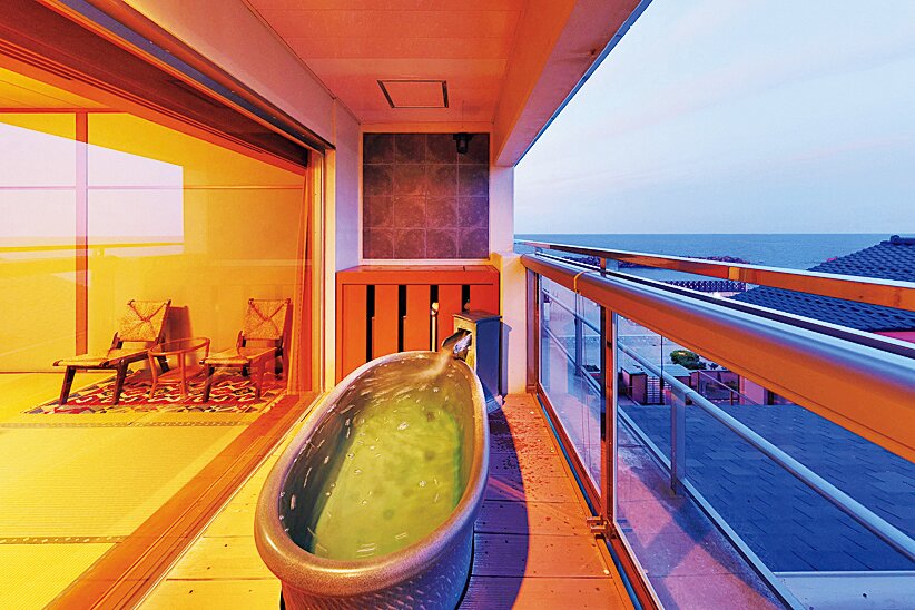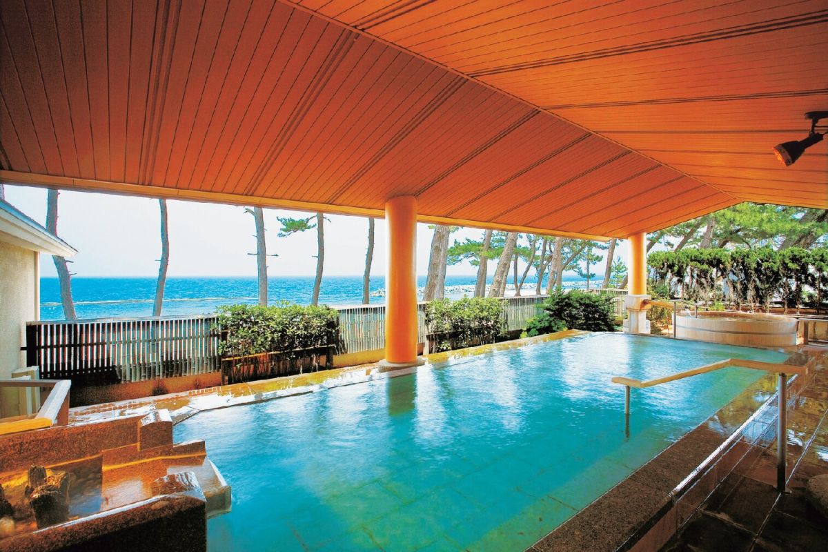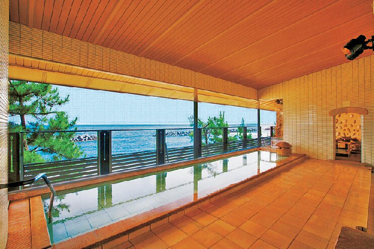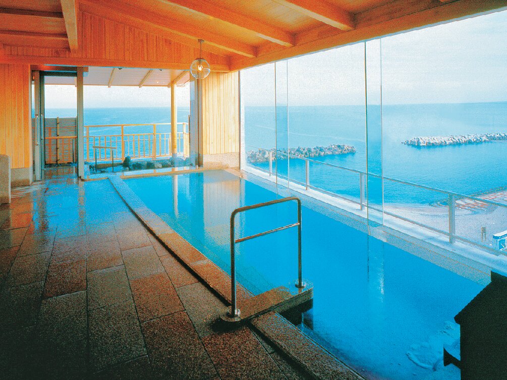 豊富な湯量を誇る自家源泉を、日本海を一望しながら楽しめるお宿。貸切風呂(50分2200円)をはじめ、エステ&アロマサロンなど設備も多彩です。