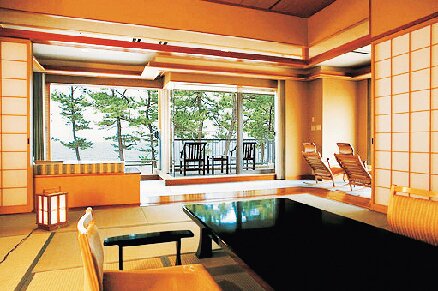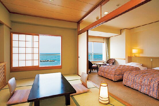 全館畳敷き、全室が日本海一望のジャグジーバス付き。客室は6種類あり、露天風呂付き客室やツインベッド客室もあります。夕食は新鮮なお造りや山陰の味覚満載の会席料理を味わえます。