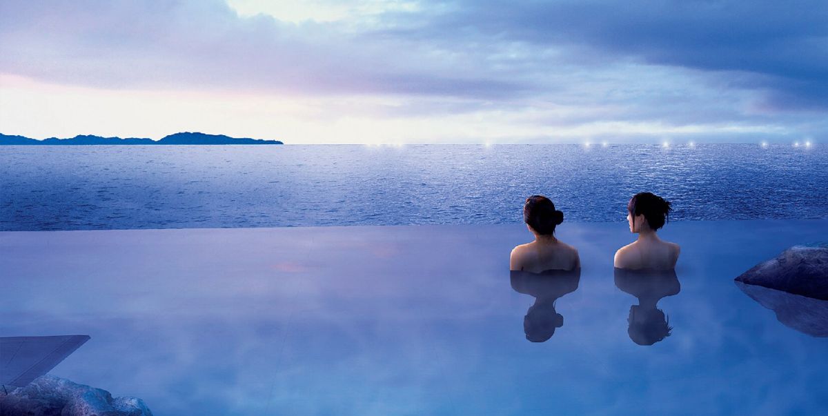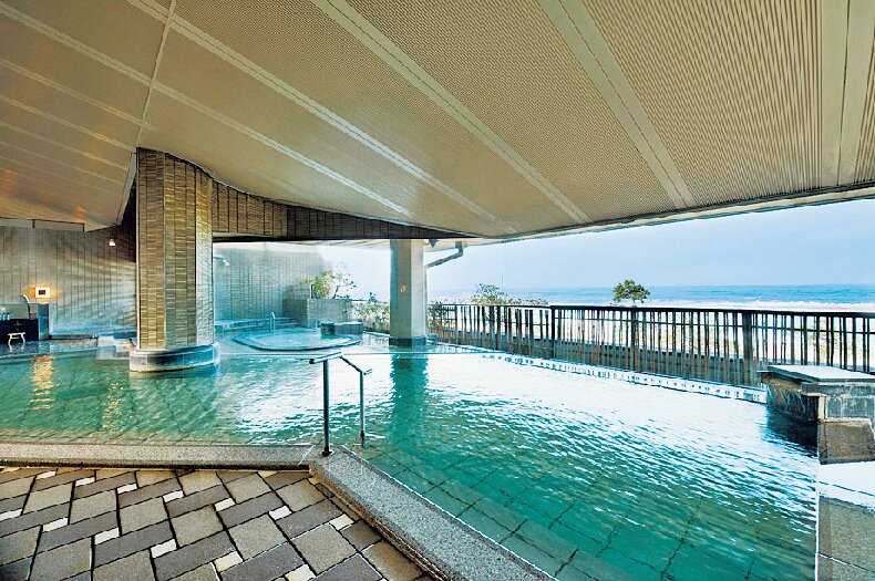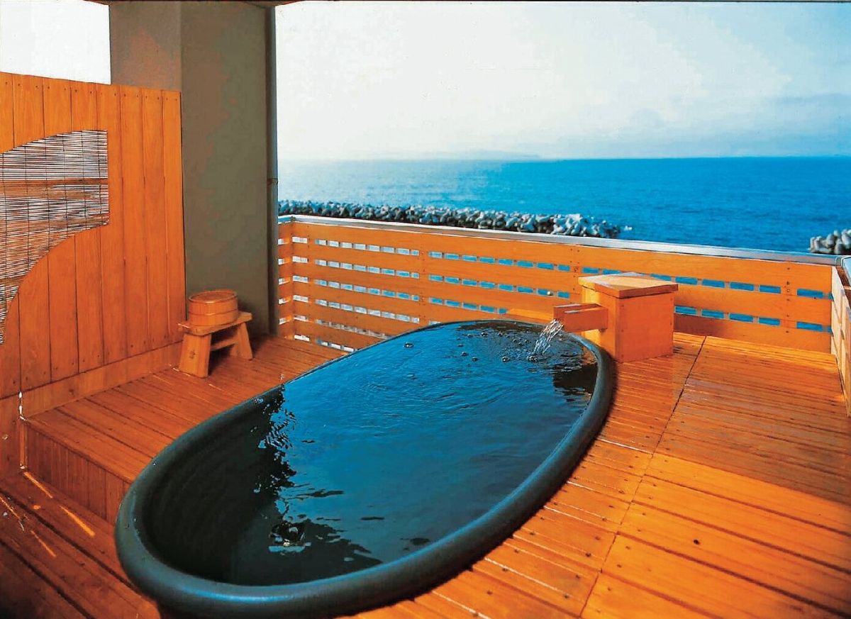 海沿いに位置し、全室がオーシャンビュー。大浴場と露天風呂はもちろん、貸切露天風呂(40分3300円)と貸切家族風呂(40分2200円)も天然温泉かけ流しです。