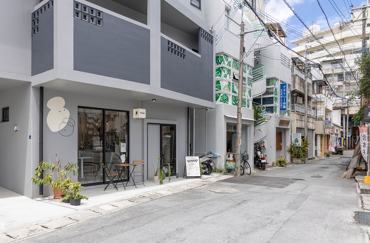 2025年4⽉末にオープンしたジェラートショップ「Scoop(すくーぷ)」は、国際通りや陶器店が軒を重ねる壺屋やちむん通りからも近く、ランチをした後にふらっと⽴ち寄るには絶好のロケーションに位置しています。沖縄県産⾷材を使⽤したこだわりジェラートでひんやりひと休み。
