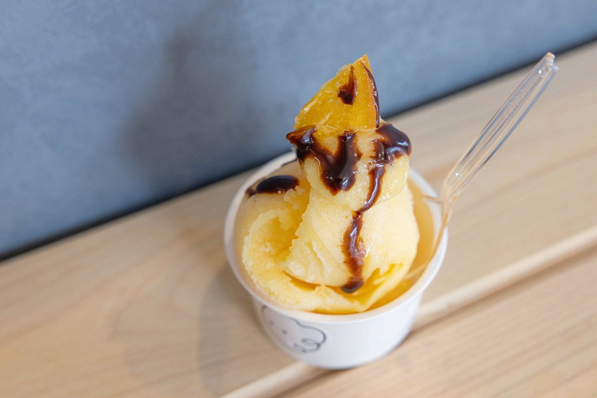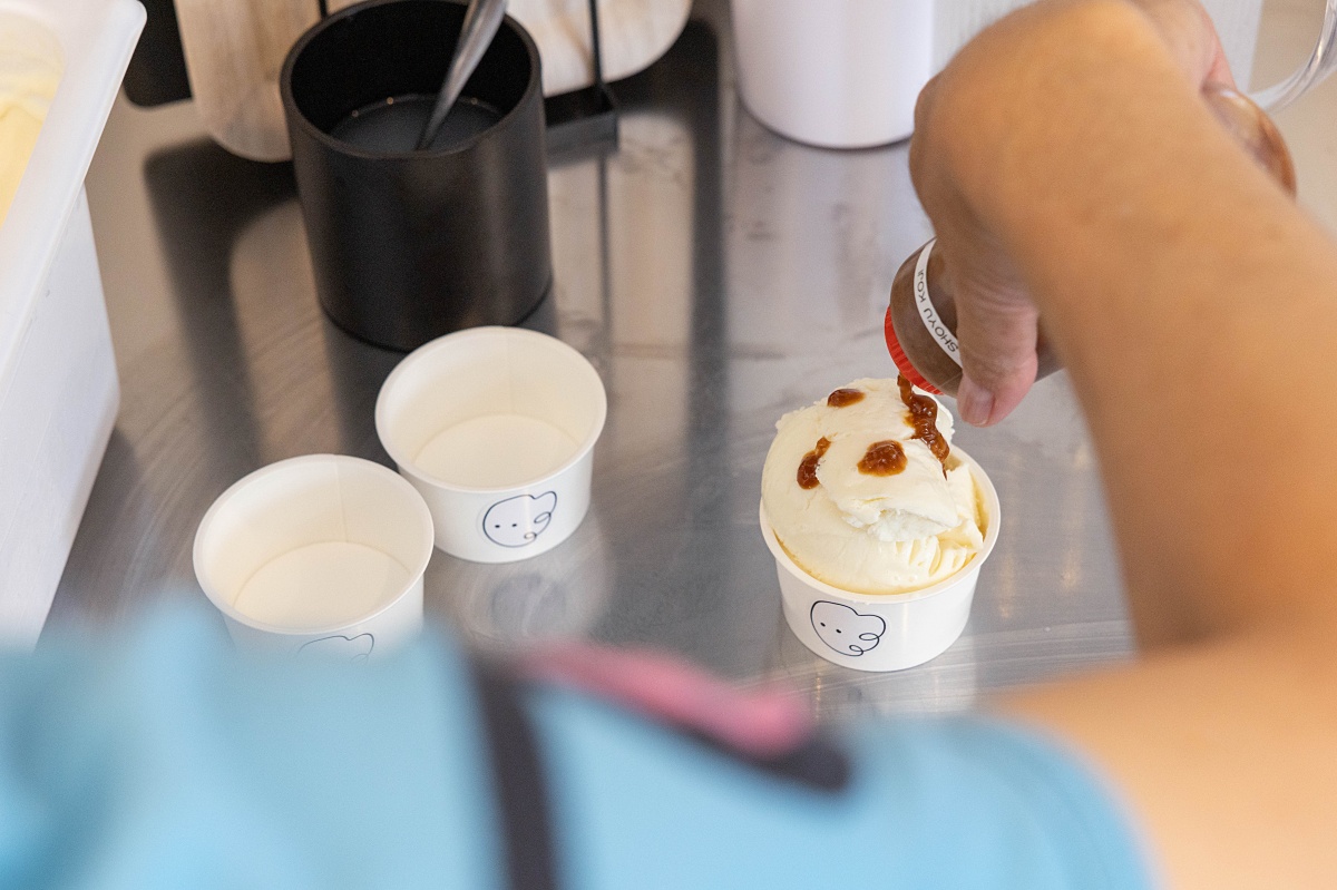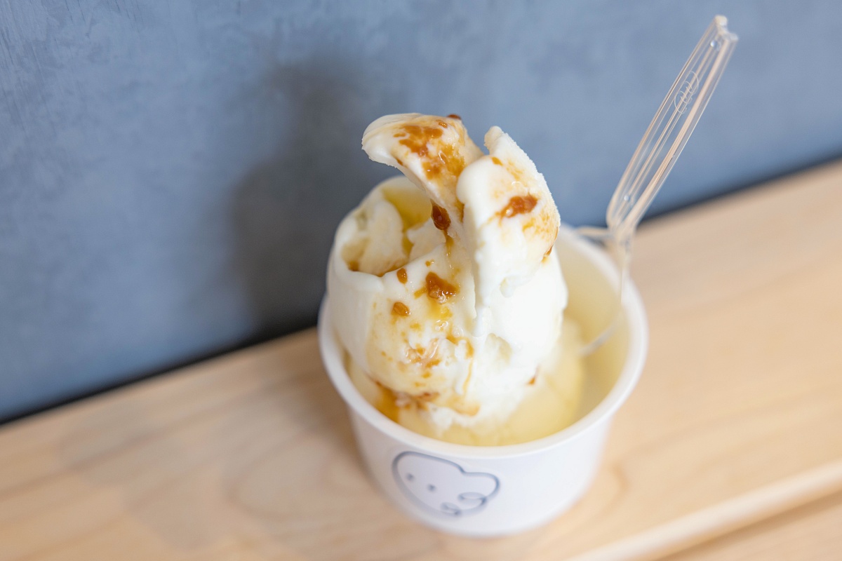 和テイストで意外性のある「島⾖腐と醤油麹」も⼈気です。こちらは、沖縄古来の伝統製法で作り続けている「なかむら⾷品」の島⾖腐を使⽤したジェラートに、オーガニックの国産醤油麹ソースをかけたもので、⽢じょっぱさが後をひきます。イメージは“みたらし団⼦”。
