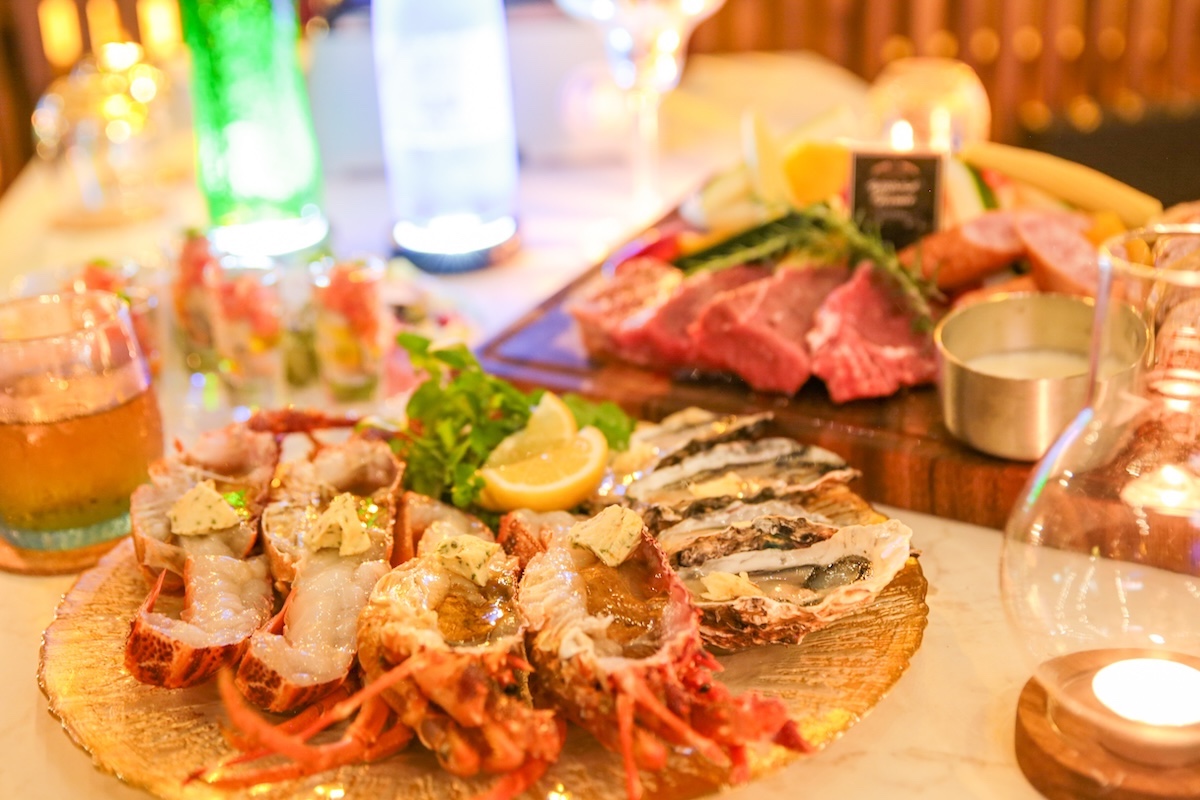 グラスフェッドサーロインステーキや焼き牡蠣、伊勢海老といった豪華なBBQコース料理に加え、自動ビールサーバーや自家製サングリア、ワイン樽など、ぜいたくなラインナップのドリンクはすべて飲み放題で楽しめます。