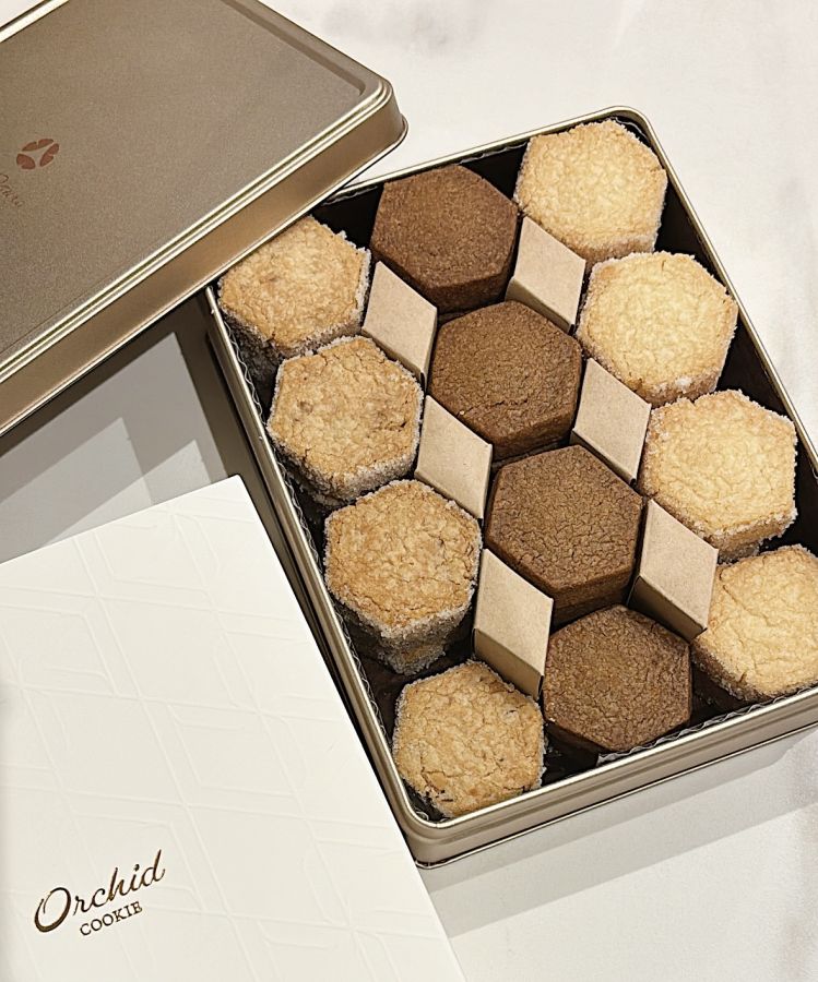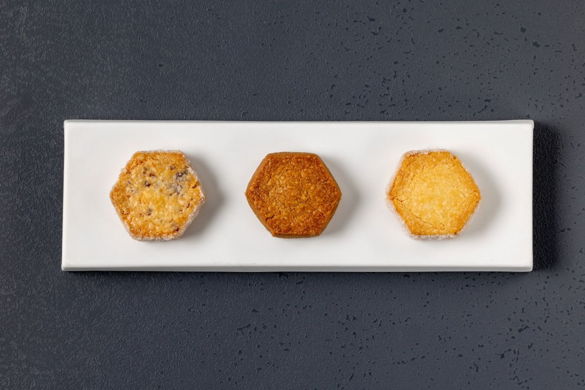 まずは「プレミアムホテルメイドレーベル」より3種類の新商品をご紹介します。「オーキッドクッキー」はシンプルで奥深い味わいの 3 種のサブレを、ホテルメイドの逸品として丁寧に焼き上げたシグネチャー商品です。館内各所の意匠にも用いられている六角形(亀甲文様)をかたどっています。