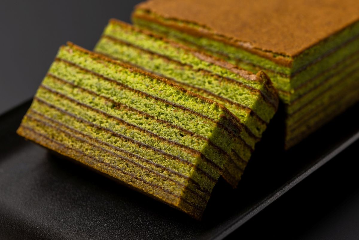 一層一層を丁寧に手焼きした8層のバウムクーヘンは、しっとりとした食感とともに宇治抹茶の豊かな香りが上品に広がります。
