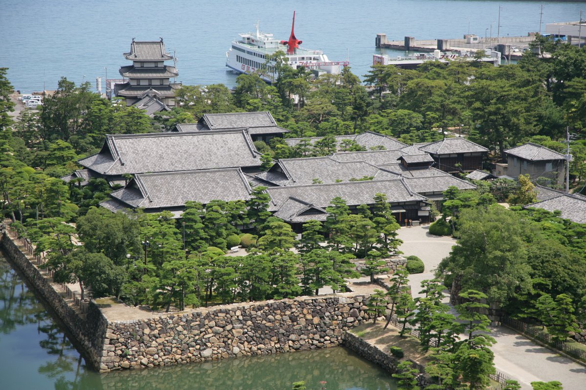 標高約66mの亀山を利用し、5年の歳月をかけて慶長7年(1602)に完成した「丸亀城(まるがめじょう)」。内堀から天守へ幾重にも積み上げられた石垣は“扇の勾配”とよばれ、美しい曲線を見せています。天守は江戸時代から残る現存木造十二天守のひとつで、最上階から眺める丸亀市街と瀬戸内海は絶景です!