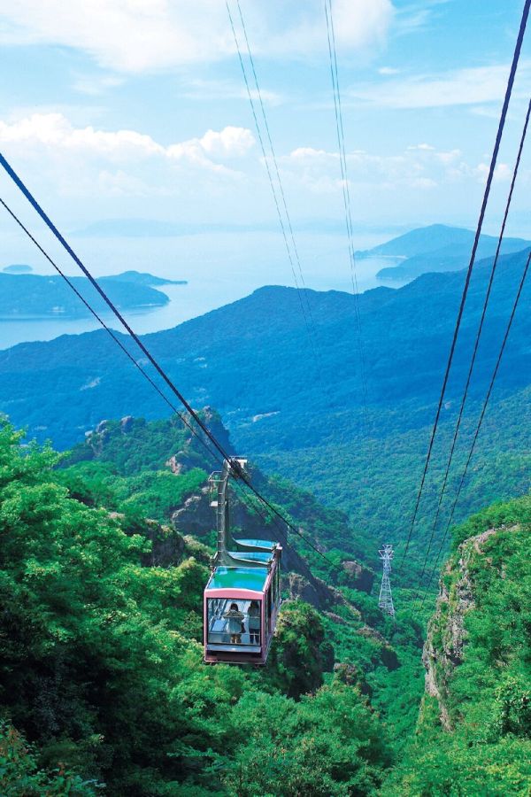 日本三大渓谷美のひとつで、天気がよければ四国の山並みや瀬戸内海も見渡せる「寒霞渓(かんかけい)」。山頂へは徒歩、ロープウェイ、クルマのどれでもアクセス可能です。秋には紅葉が美しく、標高差があるので長い期間紅葉した山々楽しめます。山頂には展望台やレストハウスもあるので、ゆったりと絶景を堪能できます。