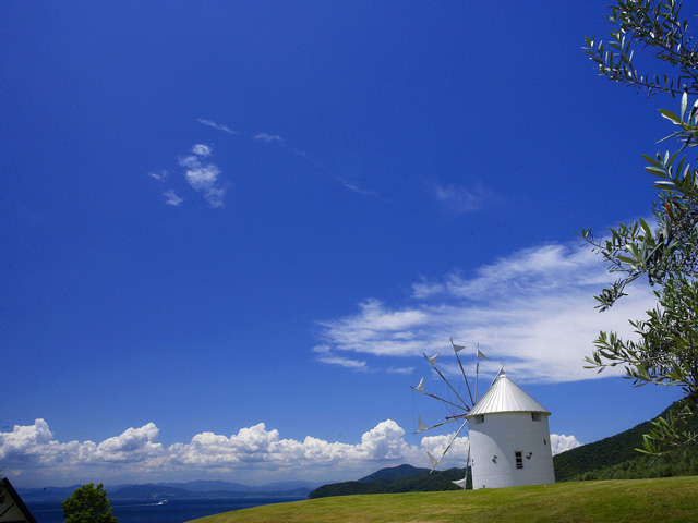 「道の駅 小豆島オリーブ公園(みちのえき しょうどしまおりーぶこうえん)」は、瀬戸内海を望む小高い丘に整備された公園。約2000本のオリーブ畑のほか、体験施設や庭園、レストラン、温泉などが併設されています。園内には実写映画『魔女の宅急便』のセットを利用した雑貨屋さんも。ほうきを無料でレンタルできるので丘の上でジャンプして写真を撮ってみましょう!