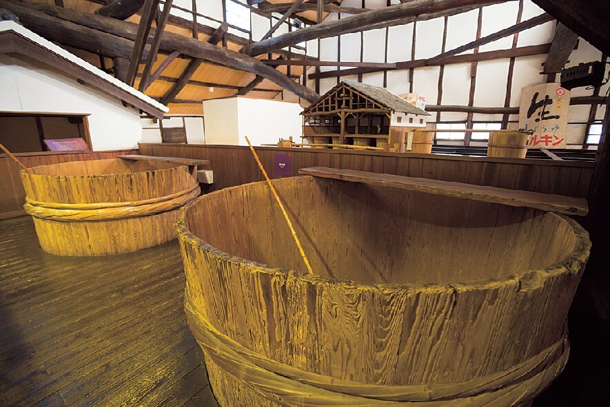 約400年の歴史を誇る小豆島の醤油造りを学べる「マルキン醤油記念館(まるきんしょうゆきねんかん)」。国の登録有形文化財に指定されている築100年以上の蔵を改装したノスタルジックな建物で、醤油造りの歴史や製造方法を紹介。昔の道具や木樽なども展示しています。物産館では限定醤油や醤油ソフトの販売もあるのでぜひ味わってみてくださいね。
