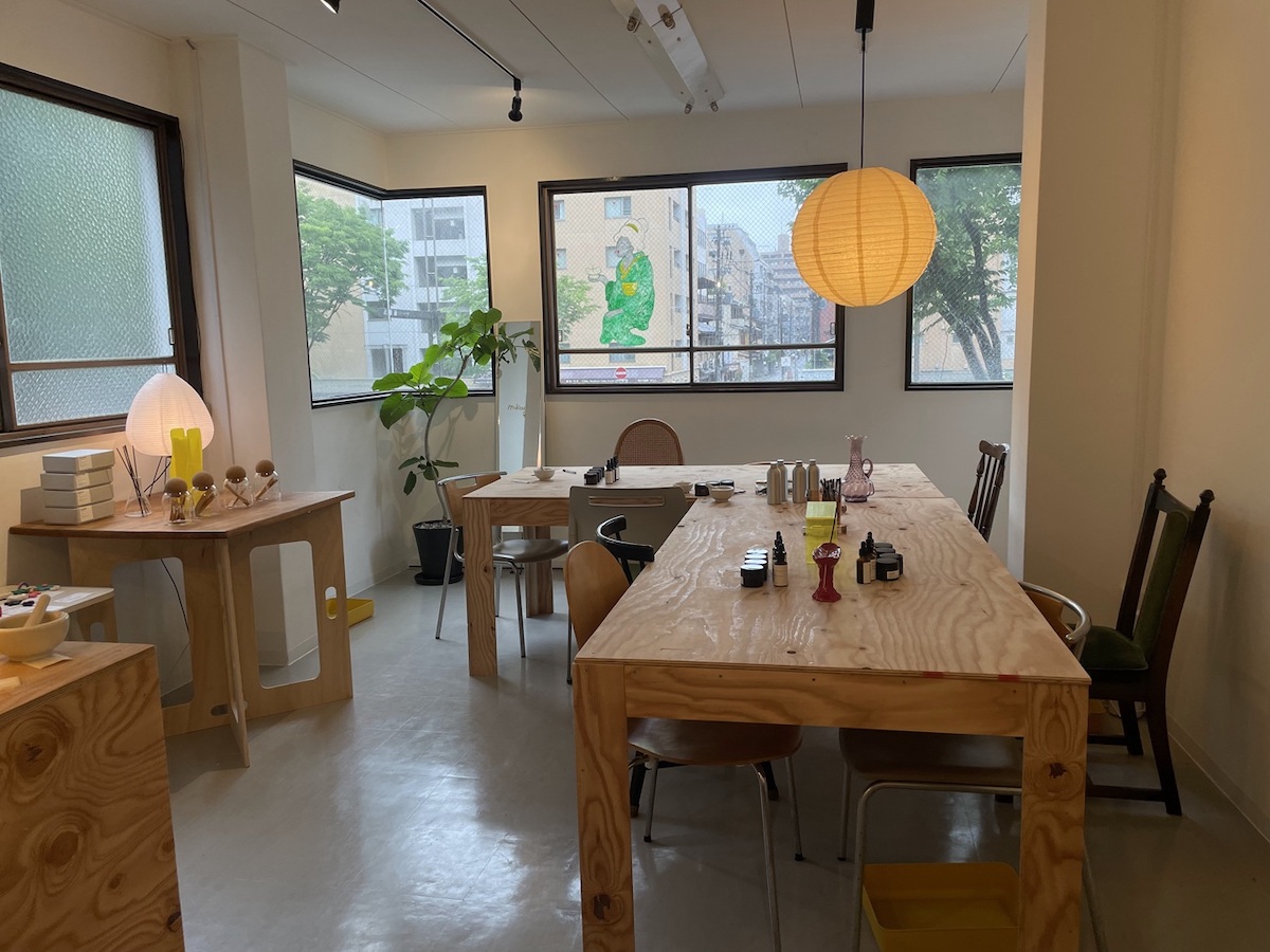 木の看板が出ているドアから入り、階段を上がってすぐの部屋が「mikou」です。部屋全体が香料の香りに包まれた、素敵なお香づくり空間。手づくりの木のテーブルが置かれた10席ほどのワークショップスペースで、あたたかみのあるアットホームな雰囲気です。