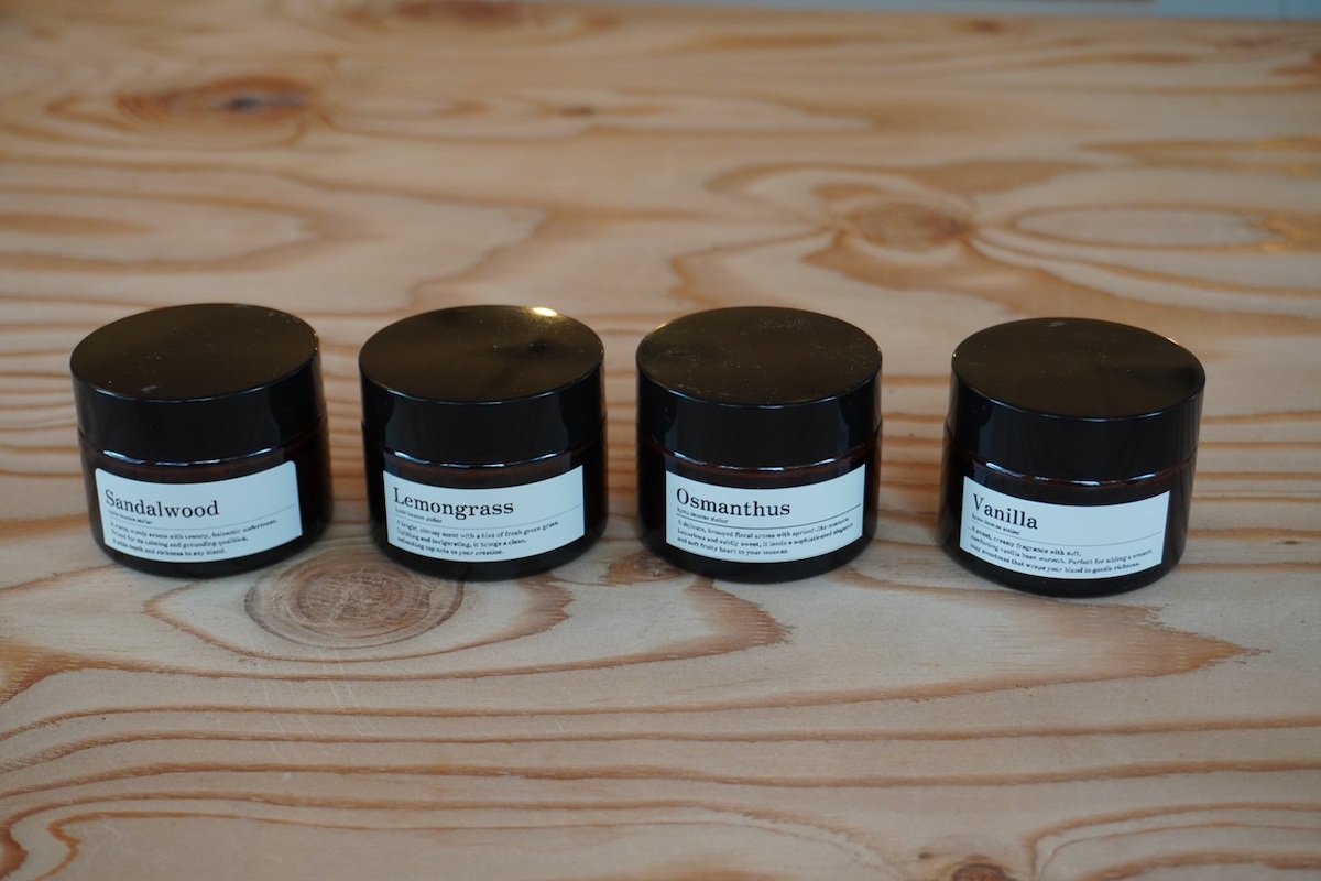 こちらが香りづくりの基本となる、粉末の香料4種類。上品な木の甘さが感じられる「白檀(サンダルウッド)」、フローラルな「キンモクセイ(オスマンサス)」、甘い香りの「バニラ」、さわやかな「レモングラス」(粉末の香料は時期により変更あり)。ひとつひとつ香料のふたを開けて、香りをかいでみます。どれも、それぞれよさがあって悩む……!