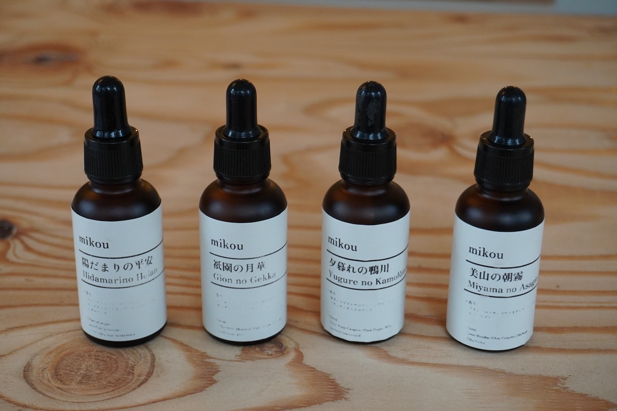 こちらは「mikou」のオリジナルアロマオイル。粉末の香料と合わせると、より高級感のある本格的な香りになるそう。柑橘系の「陽だまりの平安」、オレンジの香りがベースとなった「祇園の月華」、柑橘の柚子がベースでスパイシーな「夕暮れの鴨川」、ヒノキのウッディな香りが特徴の「美山の朝霧」など、それぞれの香りにつけられた京都らしい名前も素敵です。