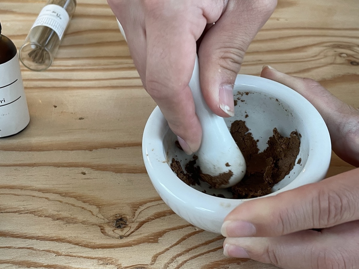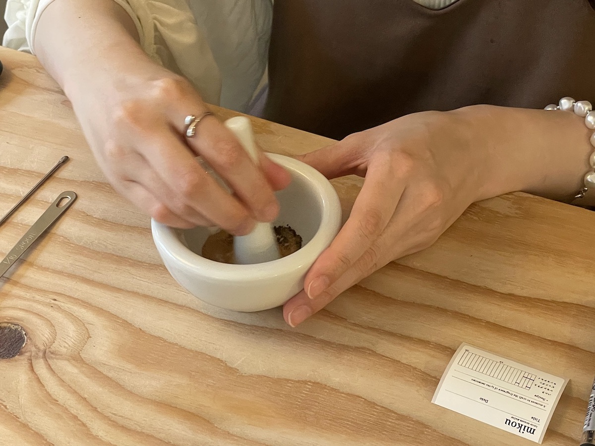 まず、粉末の4種類の香料を使って香りをつくります。最初に、ベースにする香りをひとつ決めます。組み合わせの特長などを聞き、今回は白檀をベースにすることにしました。ベースの香りを3杯鉢に入れたら、次にアクセントにしたい香りを1杯分鉢に加えます。しっかりと混ぜ、香りが変わるのを感じながら進めましょう。