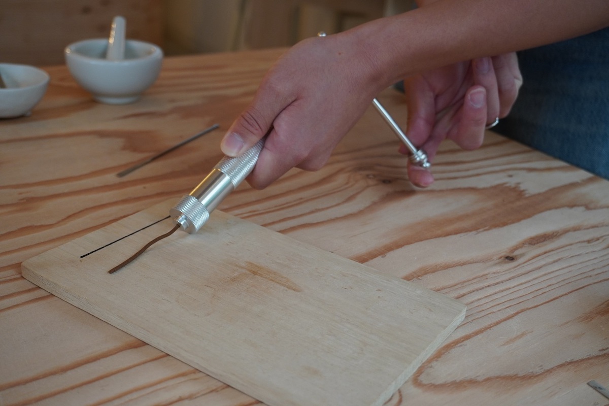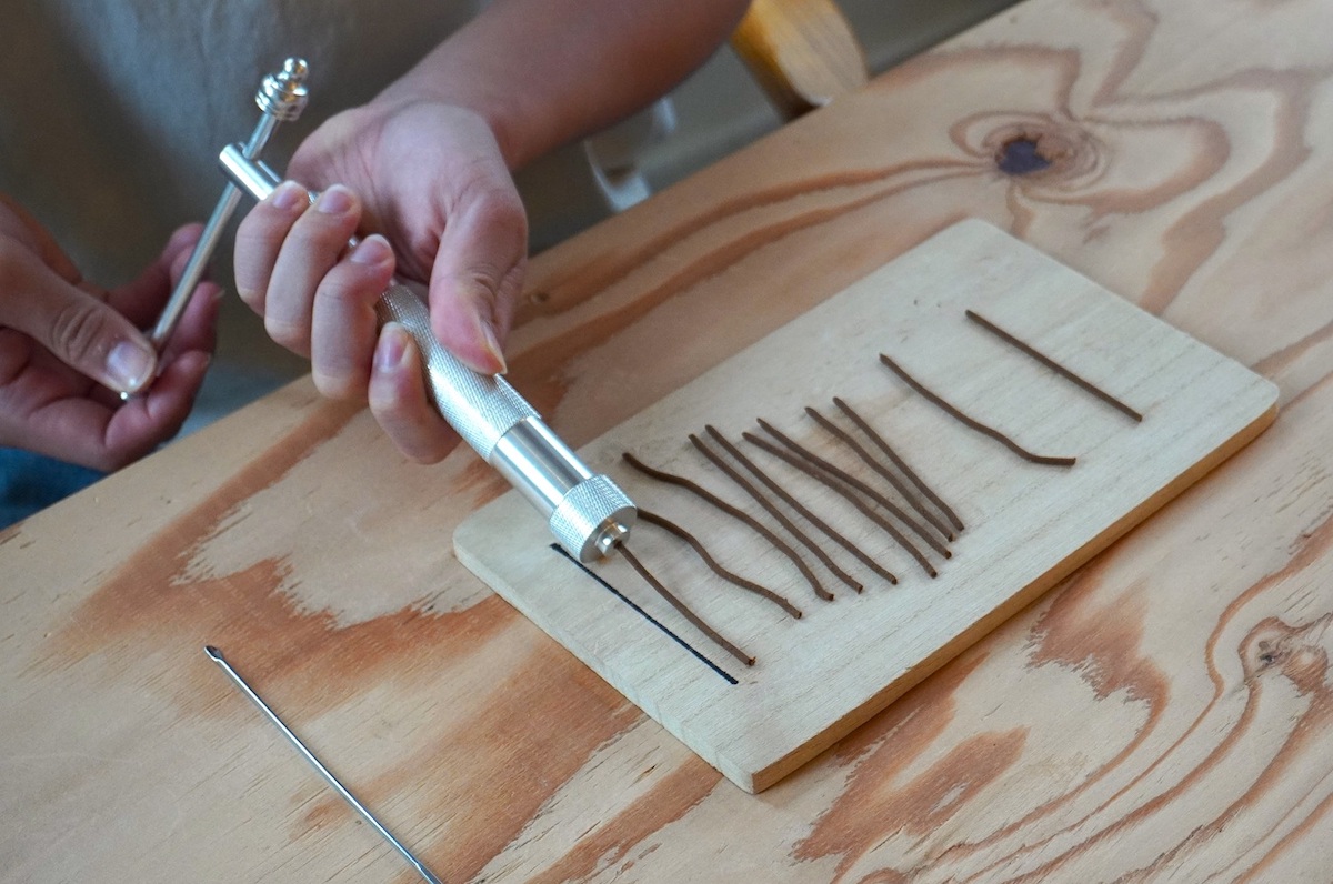 実はこの作業、結構難しくて、出てくるお香がくにゃくにゃになったり、長すぎたり。焦ってしまいますが、少しずつコツがつかめるので大丈夫。「いい感じですよ」と、声をかけてアドバイスしてくださるのもうれしいところ。曲がった線香は、コロコロ転がしたら本当にまっすぐになりました。