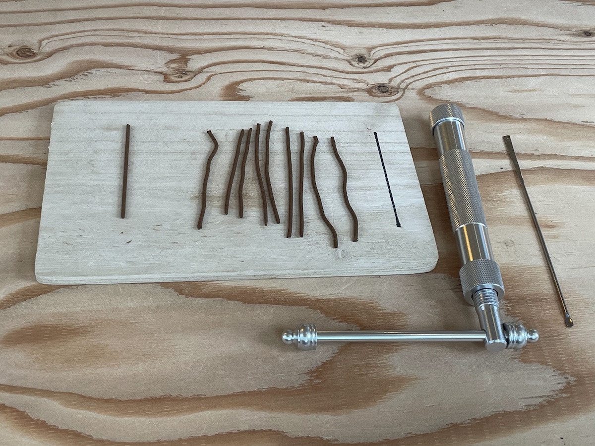 いよいよ形成です。線香形成ツールの持ち手を時計回りにゆっくり回すと、中にセットされたお香の生地が「にゅるっ!」と出てきます。トレイに引かれた黒い線を目安に、線香の長さを調節して、スッと切ります。形が曲がってしまっても、あとで転がすとまっすぐになるので大丈夫!