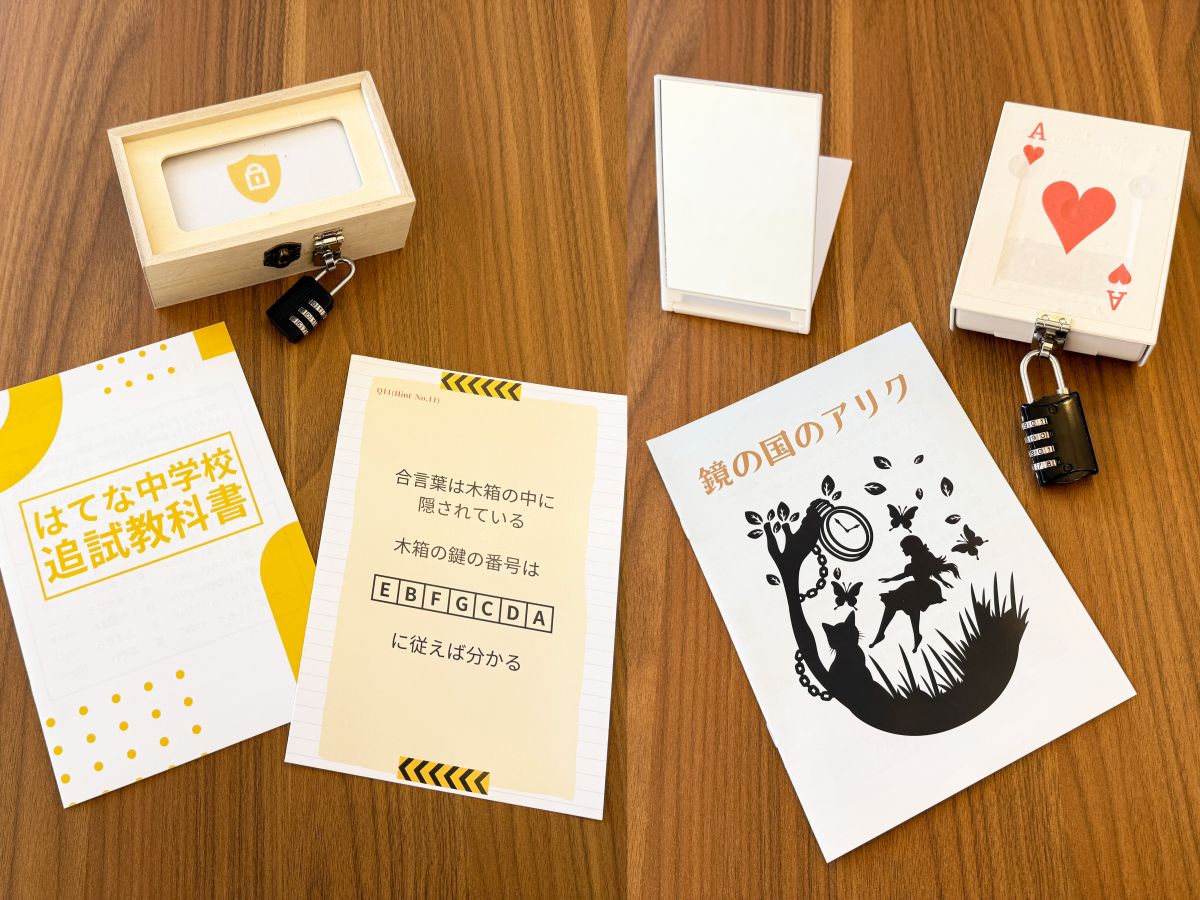 写真左の『中学校落第 危機からの脱出』は、謎解き力によって成績が決まる中学校で、試験突破のための合言葉を解き明かして、落第危機から脱出するストーリー。教科書のようなデザインのキットがおもしろいです。