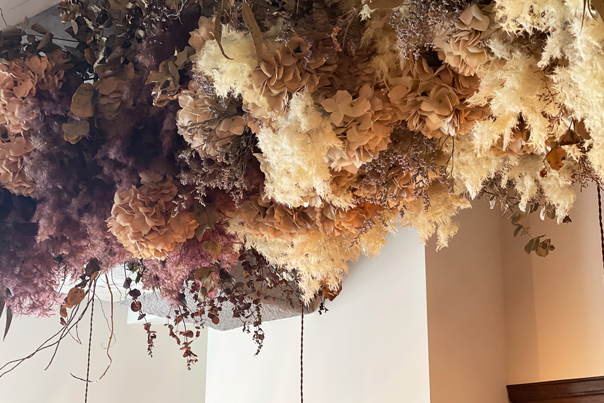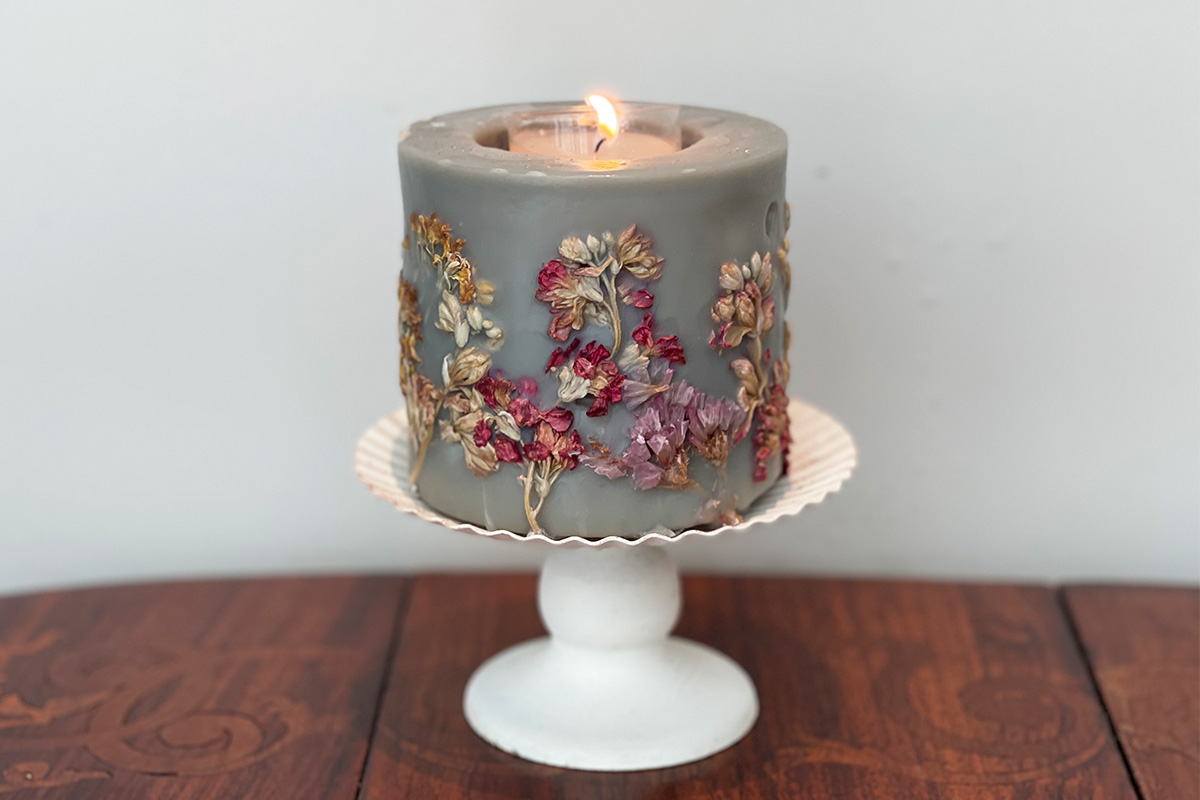 天井から吊るされたドライフラワーの装飾やテーブルの上に飾られたハンドメイドのキャンドルは、熊本県の阿蘇市にあるショップ「KHO(こう)」から取り寄せているもの。オーナーが「プリンセスタルト熊本」のオープン準備の際に知り合ったショップだそうで、中目黒店ではキャンドルの販売も行っています。今後、吉祥寺店でも販売予定だそう。
