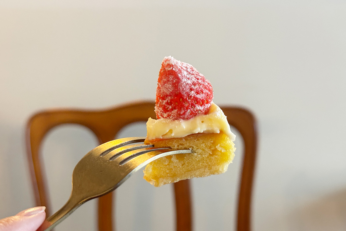 特製のカスタードクリームは甘さ控えめで、濃厚なタルトと一緒に食べても重たくなりません。さらに、クリームとタルトの間にイチゴジャムがサンドされていて、ほどよいアクセントに。シンプルな見た目ながら、細部まで計算された奥深い味わいのケーキです。