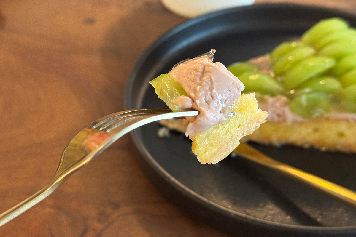 ふんわりとカシスの風味をまとった甘ずっぱいカスタードクリーム。甘いシャインマスカットと相性抜群です。やさしいピンク色のクリームとマスカットの鮮やかなグリーンが美しく、見た目も心ときめくタルトでした。