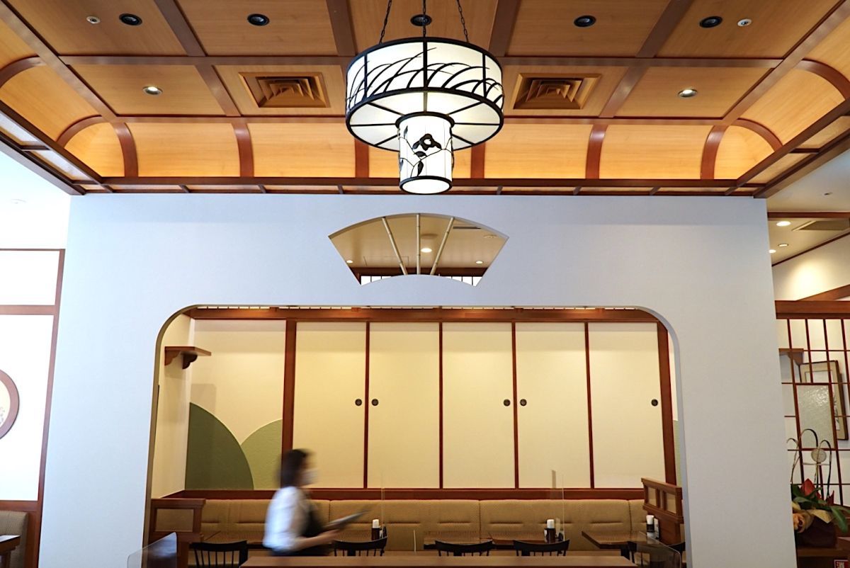 桜木町駅すぐの「コレットマーレ」2階にある「茶寮 SIKI TSUBAKIYA(さりょう しき つばきや)」。天井が高く開放的な店内。店名の由来にもなっている日本独自の「色(しき)」と「四季(しき)」や、和の文様・柄を取り入れた美しい空間です。