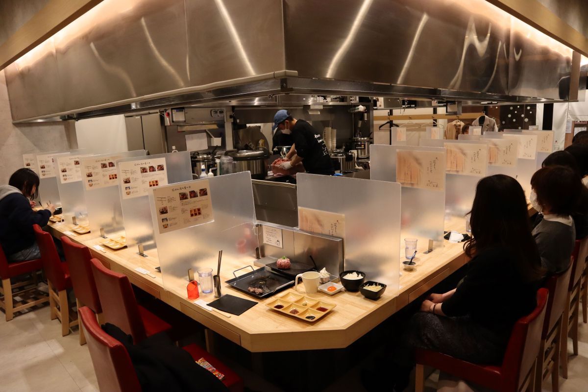 横浜駅西口から徒歩2分ほどの場所にある「花より、ハンバーグ。(はなより はんばーぐ。)」。店内はカウンターのみで18席。各席に仕切りがあり、自分専用の鉄板が用意されているので、人目を気にせず食事ができます。お客さんの6・7割が女性だそうで、ひとりで来ている女子高生の姿も。