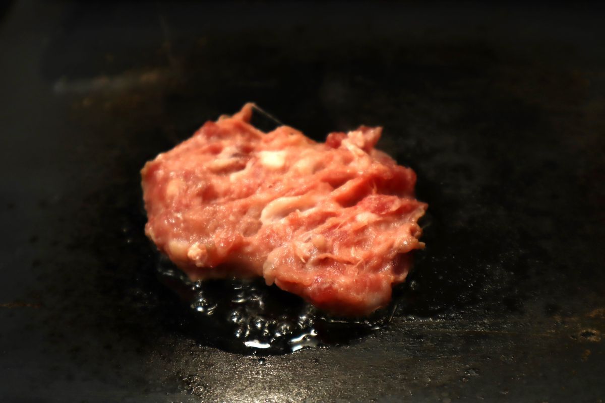 提供されたハンバーグは、表面にほんのり焼き色がついている程度で、ほとんど生の状態。これをまずは皿の上でひと口サイズにカットします。そして鉄板にのせて、肉の厚みが2㎝以下になるように伸ばし、赤身の部分がなくなるまで両面をしっかり焼きましょう。これが“焼肉スタイル”とよばれる所以。