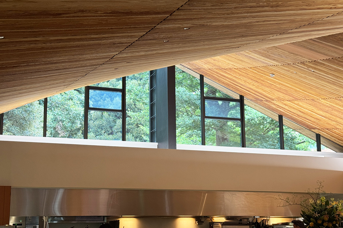 キッチンカウンターの上は屋根の傾斜に合わせて斜めに作られた勾配天井になっていて広々。木のぬくもりを感じるナチュラルな天井デザインも素敵です。天井高くにある、三角形の窓の先にも緑が広がっています。