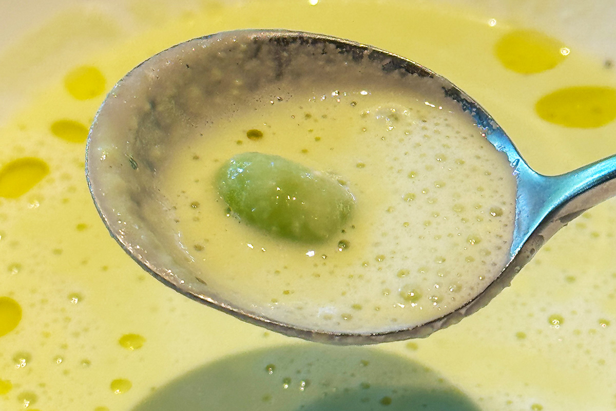 ・「枝豆の冷製スープと自家製リコッタチーズ 涼しげなミントの泡」