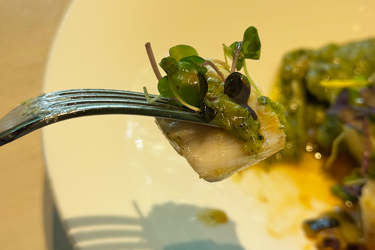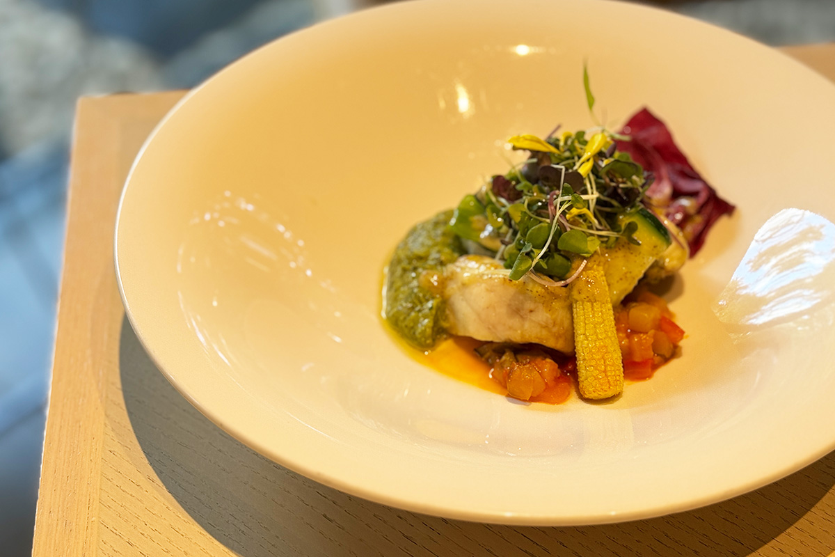 ふっくらと焼き上げられたスズキは、身のぷりっとした弾力が印象的。優しいヴェルデソース、酸味とさわやかな風味のヴィネグレットソースで味を変えながら、最後まで飽きずに味わうことができました。