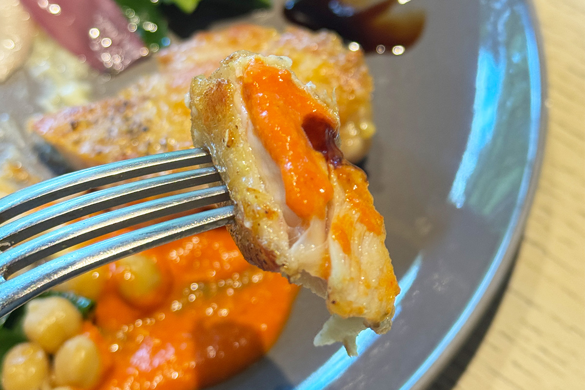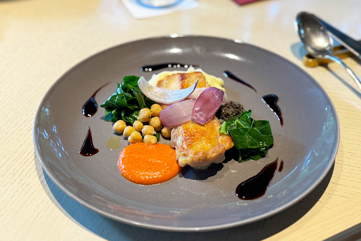 パリッと香ばしい皮と、ジューシーで軟らかな肉質が見事なハーモニー。程よく塩気が利いていて、噛むたびにじんわりとうま味がにじみ出てきます。ローストされたヒヨコマメ、赤タマネギ、ケールが添えられていて、お肉と一緒に自然な野菜の味わいを楽しむことができました。