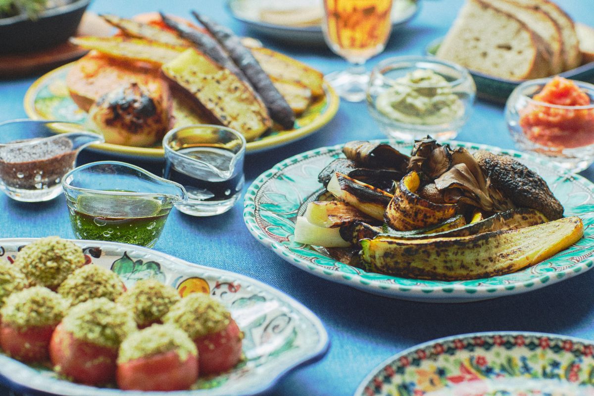 収穫した野菜は、畑の畔に設置された屋台でシェフがダイナミックに焼き上げてくれます。炭火で火を通すことで、野菜本来の甘みとうま味が最大限に引き出され、滋味深い味わいに。熟成バルサミコ酢やアンチョビマヨネーズなど5種類のソースが用意されるので、好みのソースで焼きたてを召し上がれ。
